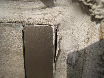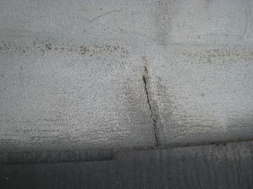 モルタル塗り外壁の亀裂です。大きい亀裂や、亀裂がたくさんあると壁の内部に雨水が浸入する可能性があります。家の内部に水のしみた跡などがある場合はすぐに専門業者に確認してもらいましょう。早期に補修をすると、建物への影響を軽減できますので定期的に外壁を確認してください。 |