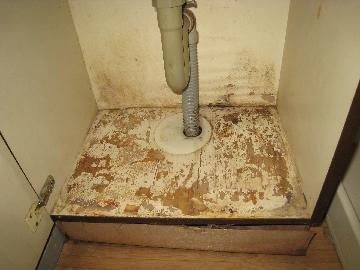 洗面化粧台の排水管より漏水があり、化粧台床板が腐食しています。荷物があり気が付かないことが多いようですが、大掃除の時などに確認してみてください。水やお湯の栓もこの部分にあり、締め付けがゆるむとやはり水が漏れます。放っておくと床板まで腐食してしまいます。さわってみて濡れているようなら、専門業者に確認してもらうことをおすすめ致します。 |