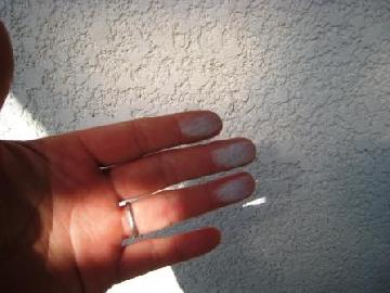 外壁面をさわって手が汚れています。これは外壁の塗膜が劣化している状況です。定期的に確認してもしこのような現象が現れたら、早めに外壁の改修工事が必要です。 |